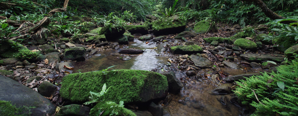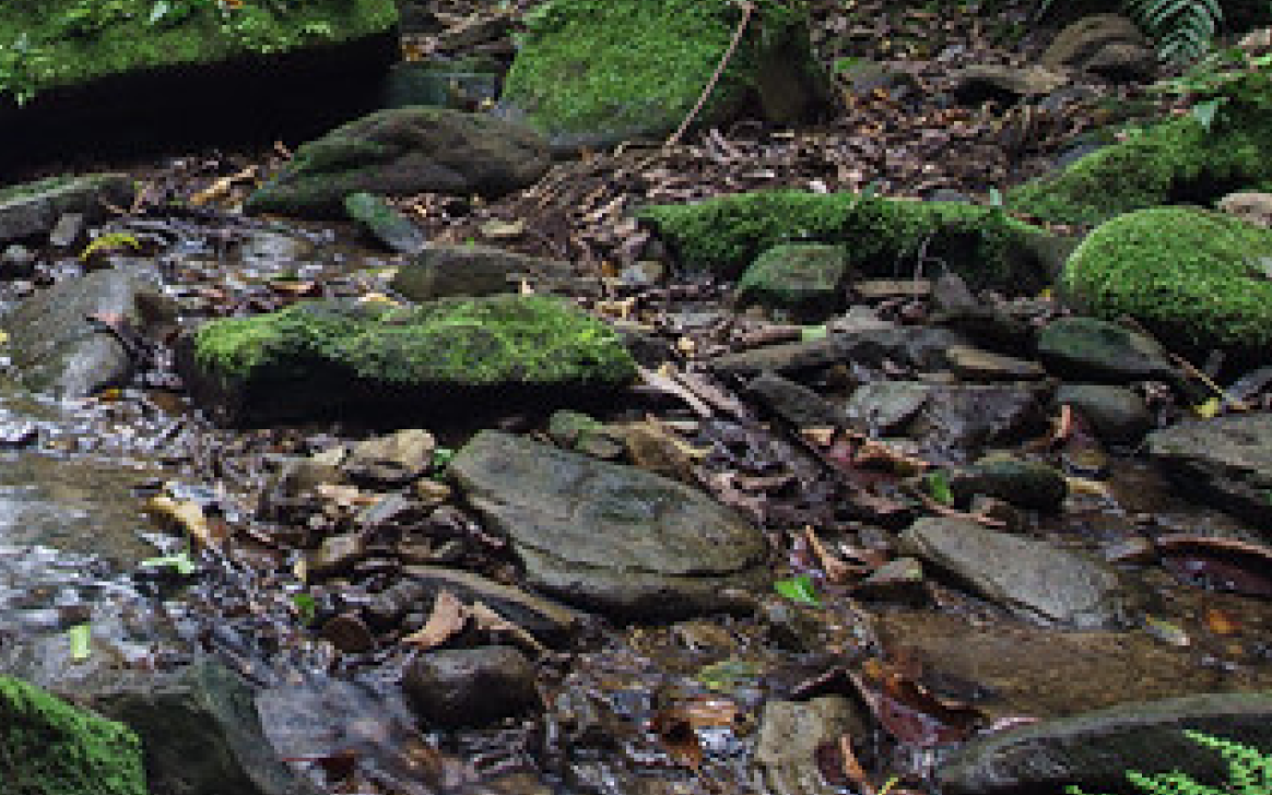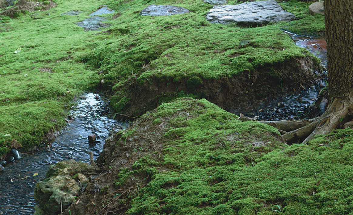 In natural environments, fallen leaves and other plants often grow on and between the stones