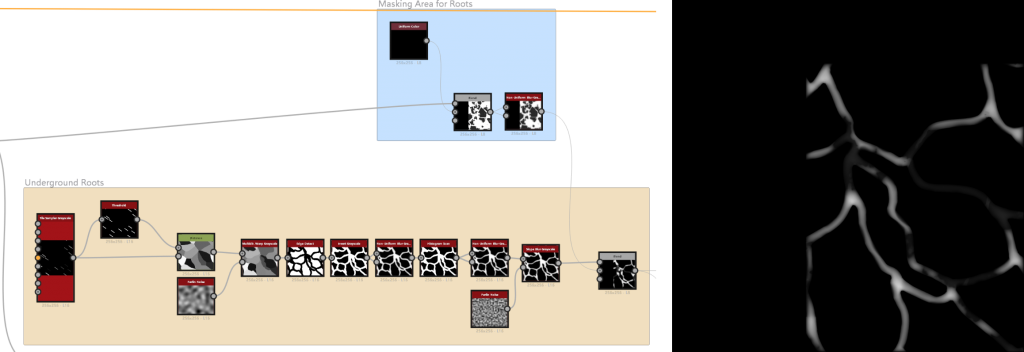 Tile Sampler Grayscale is used to establish the initial pattern, forming the basic structure of the underground root system. Multi-Directional Warp Grayscale then distorts the input, creating a more natural and irregular appearance, effectively simulating the complexity of real underground root systems.