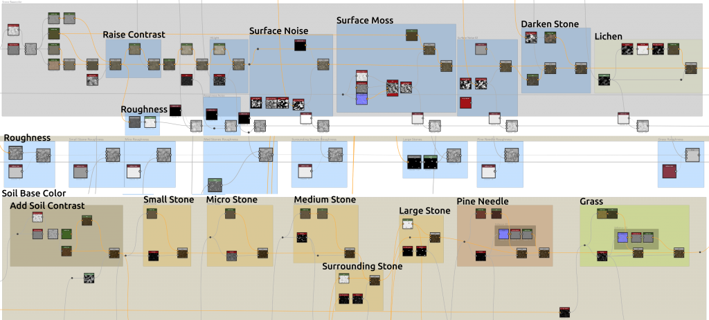 Ambient Occlusion and Grayscale maps create the base texture for colors. Gradient Map nodes generate base tones for Moss Stone Lichen, while HSL and Blend nodes enhance brightness and contrast for clearer color layers. Midtone Noise and other noise nodes add subtle random textures, simulating natural stone variations. HSL nodes enhance brightness for highlights. Splatter Circular and Voronoi nodes generate surface noise maps. Grayscale maps and Level nodes adjust roughness brightness for balanced distribution. Grayscale Map and Invert Grayscale, with noise maps, form random moss patterns. Flood Fill to Random Grayscale and Gradient Map shape cracked stones, blending them with soil. Threshold and Flood Fill define lichen shapes and areas, mimicking random surface spread.