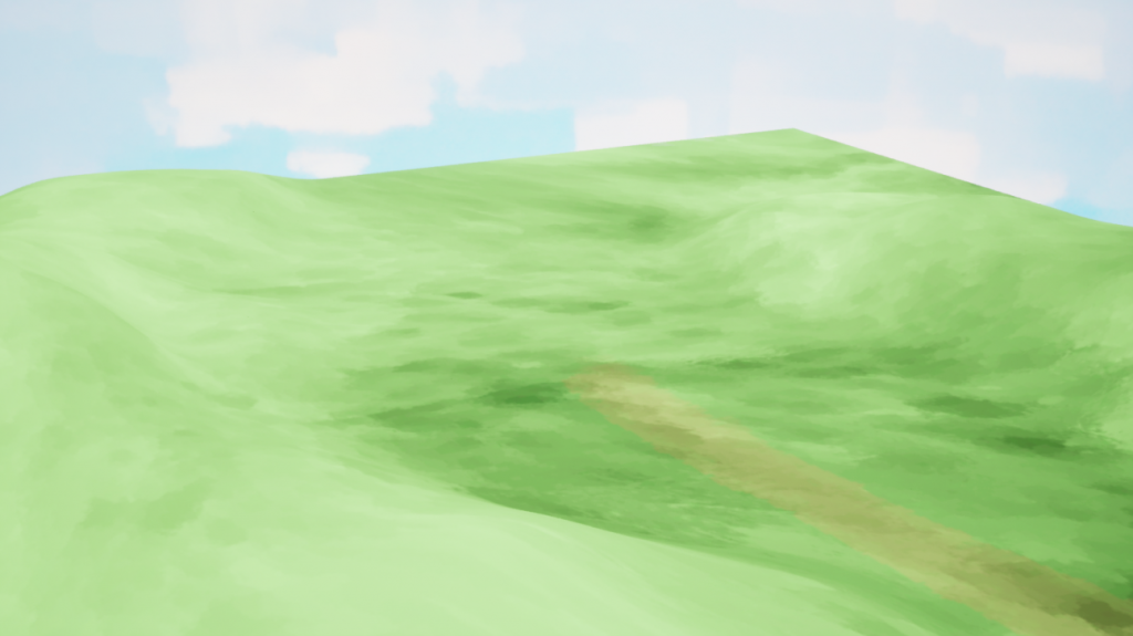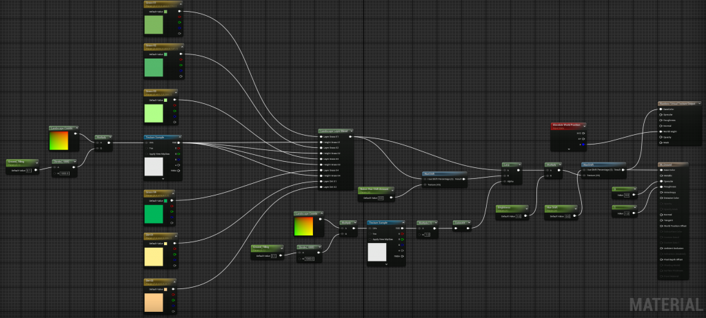 Set up a layered blend material with Landscape Coordinates for UVs and Ground_Tiling for texture tiling. Landscape Layer Blend mixes textures (e.g., grass, dirt) for painting. Add Layer Info in Landscape Mode –> Paint to enable four grass and two dirt colors.