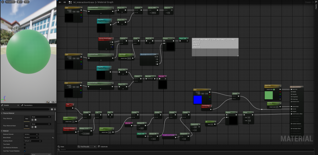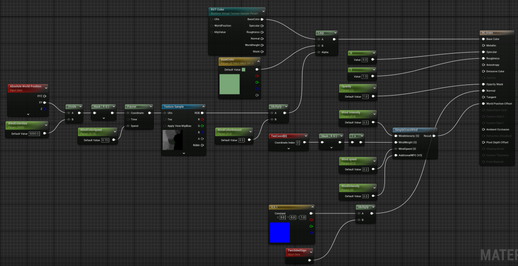 This material simulates grass swaying in the wind with color gradients. The SimpleGrassWind node adjusts positions for movement, while wind speed and gradient textures change the grass color for realism.