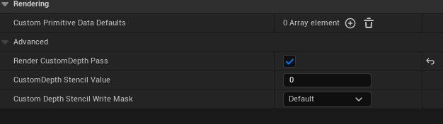 After adding the material to the Post-Process Volume, set Custom Depth-Stencil Pass to Enable with Stencil in Project Settings. Then, enable Render Custom Depth Pass for the objects to be outlined. Different Value settings give different colors.