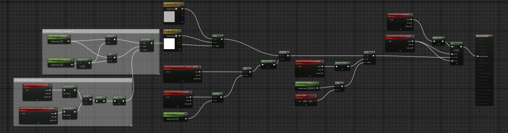 Use Constant, Multiply, and Add nodes to adjust thresholds and transition sizes. The SmoothStep node creates smooth transitions, while Lerp controls light and shadow edges based on the threshold. SceneTexture extracts scene textures, then Desaturation and Threshold nodes enhance light-shadow contrast.
